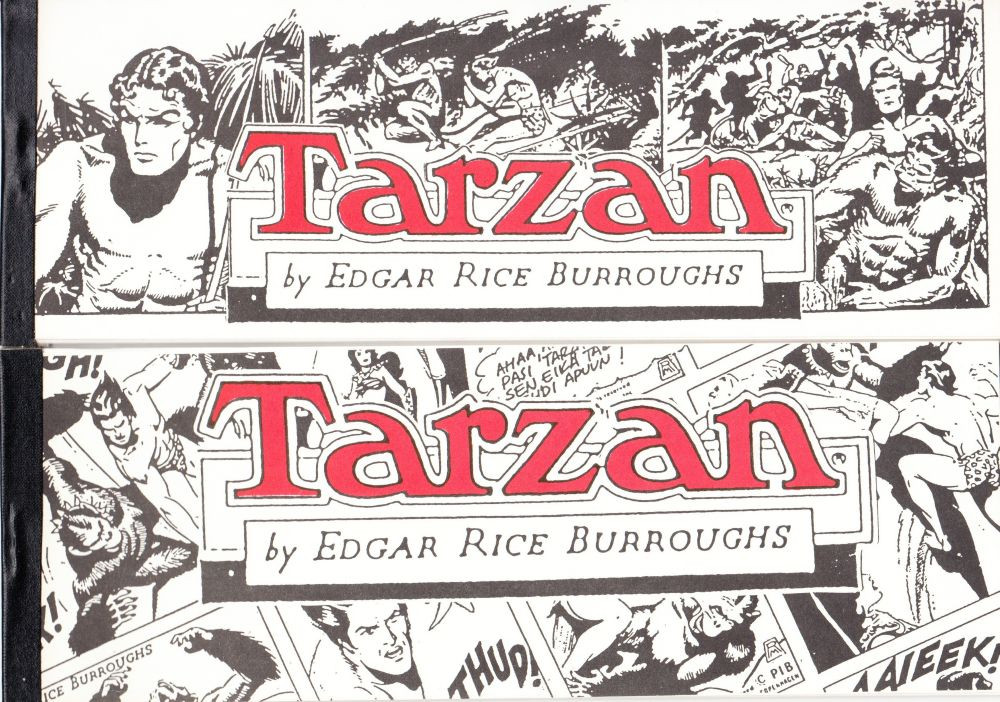Kaksi Tarzan-liuskaa, jotka syndikaatti teetti mainostarkoituksessa levittämään Tarzania suomalaisiin sanomalehtiin. Toisessa Burne Hogarthin ja toisessa Russ Manningin strippejä. Takakannessa tekijän esittely.